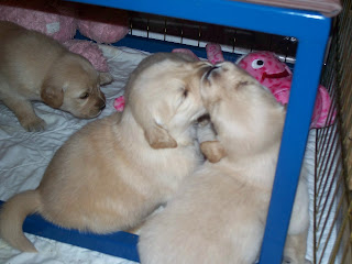 Anyway, you are probably not here to hear about me, but about the pups. They are still in their Eat/Sleep/GROW mode. They are now able to get up on all four legs and stumble a step or two. And some eyes are starting to open. Diane was the first to show a gleam in her eye. And I'm pretty sure that gleam was directed towards Sam. (I must credit that line to someone from Helping Paws.)